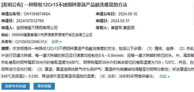 2024年8月16日,寶鋼德盛不銹鋼有限公司成功申請一項(xiàng)名為“一種降低12Cr13不銹鋼種罩退產(chǎn)品酸洗難度的方法”專利,申請公布號為CN118497466A,申請日期為2024年5月31日。
