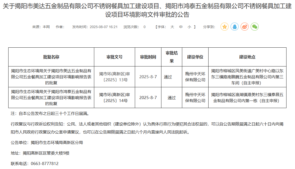 據(jù)顯示,這2個不銹鋼餐具加工建設項目分別為:陽市美達五金制品有限公司不銹鋼餐具加工建設項目、揭陽市鴻泰五金制品有限公司不銹鋼餐具加工建設項目。